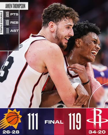 I Suns, arrivati a Houston senza Devin Booker e Bradley Beal, giocano una buona partita trovando la doppia doppia da 11 punti e 13 rimbalzi da parte di Nick Richards, ma crollano nel 4° quarto subendo un parziale di 11-2 che di fatto consegna la gara nelle mani di Houston. Amen Thompson fa segnare la quarta tripla doppia della sua carriera con 18 punti, 11 assist e 10 rimbalzi, un Tari Eason particolarmente ispirato ne aggiunge 25 con anche 9 rimbalzi e i Rockets raddrizzano una serata che sembrava poter andare storta