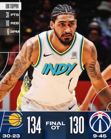 Ci vuole una rimonta da -19 e un supplementare ai Pacers per strappare una vittoria decisamente meno facile del previsto a Washington. Indiana soffre a lungo, ma riesce a riprendersi nel 4° quarto e quindi ad avere la meglio nell’overtime soprattutto grazie all’apporto dalla panchina di Obi Toppin (31 punti e 10 rimbalzi) e Bennedict Mathurin (28 punti). Anche gli Wizards pescano bene dalla panchina con i 21 punti e il 5/6 da tre di Corey Kispert, ma crollano nell’ultima parte di gara