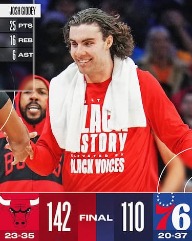 Altra serata tragica, sportivamente parlando, nella disgraziata stagione dei Sixers, che tra le mura di casa vanno sotto anche di 50 punti contro una non certo irresistibile Chicago e collezionano l’8^ sconfitta consecutiva. I Bulls si godono un Josh Giddey da 26 punti, 16 rimbalzi e 6 assist e la buona prestazione anche da parte di Kevin Huerter, che chiude a quota 23 tirando 7/11 da tre. Kelly Oubre Jr. e Paul George, autori di 19 punti a testa, sono gli unici tra le fila di Philadelphia a dare l’idea di voler provare a giocarsela