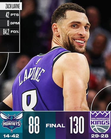 Nelle speranze dei Kings di tornare a strappare un posto al play-in a Ovest pesa e peserà molto l’arrivo di Zach LaVine da Chicago. Fin qui l’ex Bulls aveva giocato discretamente ma senza entusiasmare, ma contro gli Hornets arriva un acuto da 42 punti con 16/19 al tiro e uno strabiliante 8/9 da dietro la linea dei tre punti