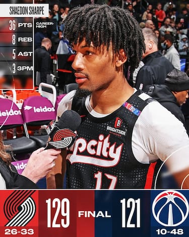 Inizialmente contro gli Wizards Shaedon Sharpe parte dalla panchina, ma, complice anche l’infortunio ad Avdija, si ritrova ben presto in campo, senza quasi più uscirne. L’ala dei Blazers regala infatti una grande prestazione, trovando il career high con 36 punti a cui aggiunge anche 8 rimbalzi, 5 assist e una serie di giocate che strappano applausi anche ai tifosi avversari