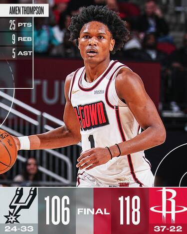 Houston non si fa pregare e approfitta di una versione rimaneggiata degli Spurs, ancora alla ricerca di un nuovo equilibrio di squadra dopo la notizia della chiusura di stagione anticipata per Victor Wembanyama, partendo forte e controllando per il resto della partita. Amen Thompson (25 punti e 9 rimbalzi) e Jalen Green (21 punti e 7 rimbalzi) spingono l’attacco dei Rockets, mentre agli Spurs non resta altro che consolarsi con i segnali di crescita del rookie Stephon Castle, autore di 22 punti con anche 7 rimbalzi e 5 assist entrando dalla panchina