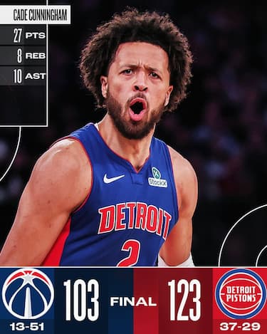 Tutto facile per i Pistons, che trascinata da un Cade Cunningham che sfiora la tripla doppia con 27 punti, 10 assist e 8 rimbalzi e dalla doppia doppia di Jalen Duren (15 punti e 13 rimbalzi) travolgono Washington. Gli Wizards vanno sotto fin dall’inizio e la loro reazione tardiva si traduce in due espulsioni per due falli antisportivi fischiati prima a Richaun Holmes e poi a Marcus Smart nel 4° quarto. Per la lanciatissima Detroit, ora davvero a un soffio dal 4° postoa Est, si tratta della 12^ vittoria nelle ultime 15 partite