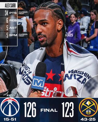 Di fronte ha il miglior giocatore del pianeta e, forse esaltato dallo scontro diretto, a Denver Alex Sarr gioca forse la miglior partita della sua annata da rookie. Il francese tiene eccome il campo e chiude con 34 punti, 6 rimbalzi e 5 assistche pesano nel successo degli Wizards
