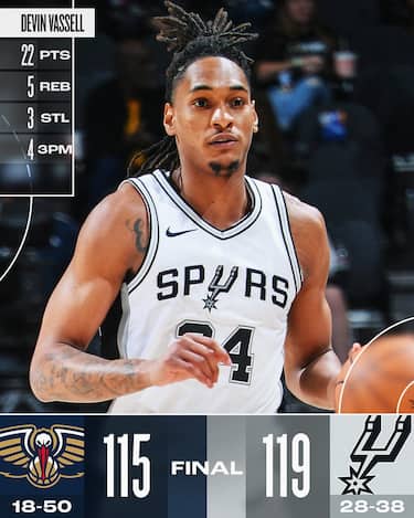 Nella sfida tra due squadre che non hanno più molto da chiedere alla stagione escono vincitori gli Spurs, che hanno la meglio in volata grazie ai 22 punti di Devin Vassell e ai 19 in uscita dalla panchina di Keldon Johnson. San Antonio si gode anche il rookie Stephon Castle, che parte in quintetto e chiude con 17 punti e 7 assist. I Pelicans giocano con buona energia, trovano 26 punti e 9 assist dal veterano CJ McCollum e 20 da Trey Murphy III, ma cedono nel finale di partita