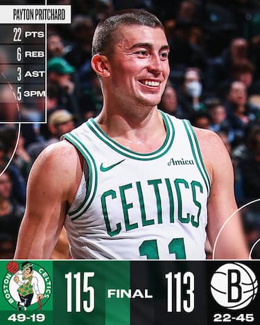 Boston arriva col fiato corto nel finale alla seconda partita di un back-to-back in trasferta, ma riesce ad avere la meglio sui combattivi Nets. Il rientrante Kristaps Porzingis segna 14 dei suoi 24 punti di serata nel 4° periodo e Jayson Tatum sfiora la tripla doppia (20 punti, 8 rimbalzi e 8 assist), ma sono i 22 dalla panchina di Payton Pritchard a fare la differenza in una serata in cui Brooklyn tira da tre più di Boston (20/46 contro il 13/38 dei Celtics). Cam Johnson è il migliore dei suoi con 23 punti seguito dai 21 di Keon Johnson, ma la sua conclusione da metà campo per la vittoria non arriva in tempo, oltre a mancare di molto il bersaglio grosso