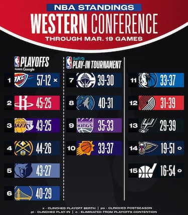 I Lakers battono Denver nel confronto diretto e si riprendono il 3° posto a Ovest, dove Oklahoma City continua la sua corsa solitaria in vetta e Minnesota non approfitta della possibilità di avvicinarsi al 6° posto perdendo a sorpresa in casa contro i Pelicans