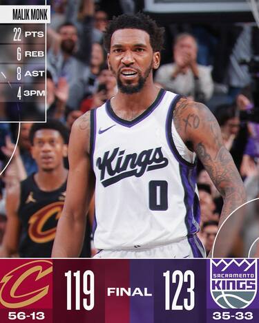 Sono i canestri nel finale di DeMar DeRozan (27 punti) e Malik Monk (22 punti e 8 assist) a regalare ai Kings, bravi nel mandare ben 7 giocatori in doppia cifra, una vittoria preziosa e prestigiosa ai danni di Cleveland. I Cavs, arrivati alla seconda partita della loro lunga trasferta a Ovest, perdono ancora dopo la sconfitta patita in casa dei Clippers la notte precedente. Donovan Mitchell segna 26 punti e prova a battagliare con gli avversari nel punto a punto conclusivo, ma non riesce a trascinare i suoi oltre l’ostacolo rappresentato da Sacramento