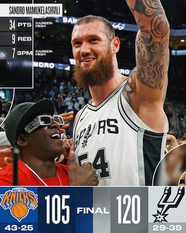 34 punti, 9 rimbalzi, 3 assist, 13/14 dal campo e 7/7 da dietro la linea dei tre punti in meno di 20 minuti giocati uscendo dalla panchina. Difficile, davvero difficile per chiunque fare meglio di quanto combinato da Sandro Mamukelashvili, eroe a sorpresa della bella vittoria di San Antonio sui Knicks