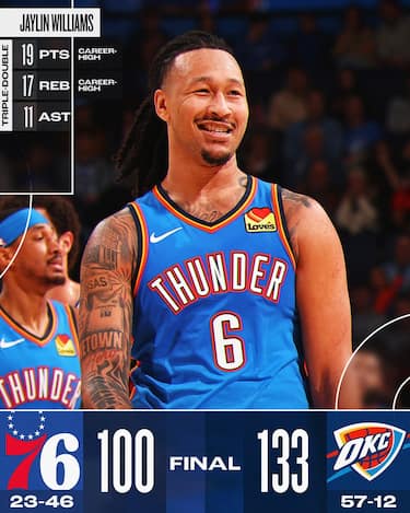 I Thunder in queste ultime stagioni ci hanno abituato a grandi prestazioni da parte di Jalen Williams, ma con l’ala ferma ai box per recuperare dall’infortunio a prendersi la scena contro i Sixers è il quasi omonimo Jaylin Williams. Per lui career high con 19 punti e seconda tripla doppia in carriera grazie ai 17 rimbalzi e 11 assist mandati a referto