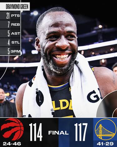 Sedicesima vittoria nelle 19 partite disputate da quando è arrivato Jimmy Butler per i Golden State Warriors, che superano Toronto pur dovendo fare a meno di Steph Curry, uscito dal campo a 15 minuti dalla fine per infortunio senza più rientrare. Draymond Green prende le redini della squadra chiudendo con 21 punti e la solita difesa eccezionale, aiutato da Quinten Post (6 triple per 18 punti) e da Jimmy Butler per tenere a bada uno Scottie Barnes da 29 punti e 10 rimbalzi a fine gara