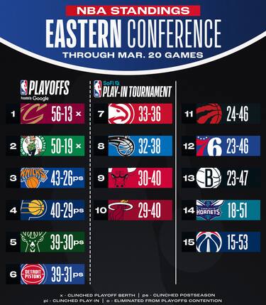 Indiana mantiene il quarto posto davanti a Milwaukee e si avvicina a tre gare di distanza da New York per il terzo. Chicago stacca Miami tenendo il nono posto, Toronto ormai fuori da ogni discorso per quanto riguarda il torneo play-in