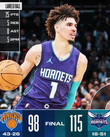 Quarta vittoria nelle ultime sette per gli Hornets, che mandano cinque giocatori in doppia cifra guidati dai 25 punti di LaMelo Ball e hanno la meglio sui Knicks, toccando anche il +19 in un match mai in discussione. OG Anunoby segna 25 punti e Karl-Anthony Towns firma una doppia doppia da 24 e 10 rimbalzi, ma i Knicks non riescono a sopperire all’assenza di Jalen Brunson e perdono per la sesta volta nelle ultime nove partite, pagando a caro prezzo la serata da 15/32 dall’arco dei padroni di casa