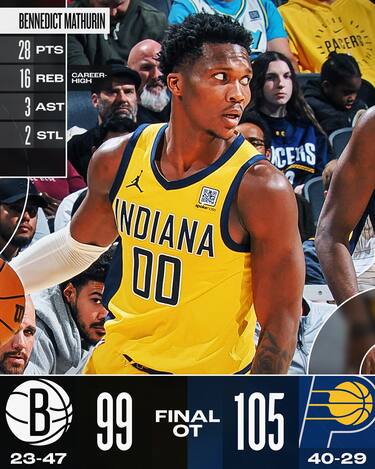 Serve un tempo supplementare e una rimonta da -10 all’intervallo ai Pacers per avere ragione dei Nets. Il grande protagonista della quinta vittoria nelle ultime sei partite, di cui le ultime tre senza Tyrese Haliburton infortunato, è Bennedict Mathurin, che segna 6 dei suoi 28 punti nell’overtime aggiungendo anche il suo massimo in carriera da 16 rimbalzi. Myles Turner chiude con 23 punti, 10 rimbalzi e 5 stoppate e Indiana mantiene il quarto posto a Est. Sono invece 12 le sconfitte nelle ultime 14 partite per i Nets, a cui non bastano i 22 punti a testa di Ziaire Williams e D’Angelo Russell