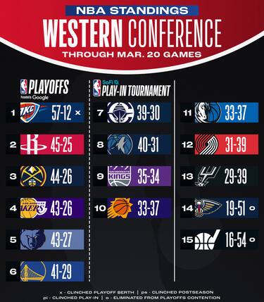 Pur sconfitta nell’ultima partita, Denver si riprende il terzo posto approfittando del ko dei Lakers, ma dalla seconda alla quinta posizione ci sono solo due gare di differenza. Golden State prova ad allungare nei confronti di Clippers e Minnesota per tenere il sesto posto, Sacramento resta nona. OKC, nel frattempo, si è matematicamente assicurata la Western Conference