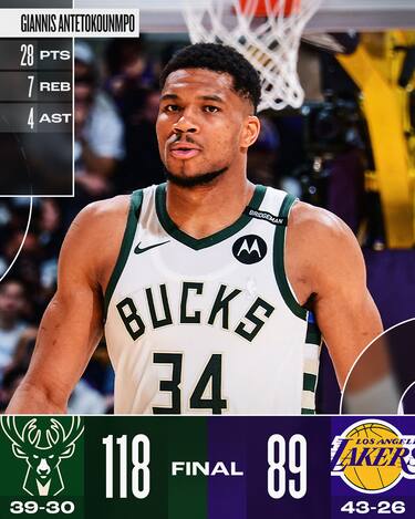 Arrivati alla sesta partita nel giro di otto giorni, i Lakers decidono di tenere a riposo tutti i giocatori più importanti, dando ampio spazio alle riserve e perdendo nettamente contro i Bucks. Giannis Antetokounmpo fa quello che vuole chiudendo con 28 punti per guidare Milwaukee al successo, interrompendo la striscia di nove successi consecutivi in casa dei gialloviola — i cui migliori realizzatori con 17 punti sono Dalton Knecht e Bronny James, alla sua prima doppia cifra in carriera in NBA tirando 7/10. Il parziale di 20-5 piazzato dagli ospiti (privi di Damian Lillard per un infortunio al polpaccio) non ha lasciato scampo ai Lakers, che abbandonano il terzo posto in classifica a Ovest