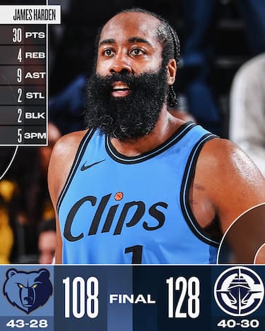 Sono i 30 punti e 9 assist di un ispiratissimo James Harden a trascinare i Clippers alla vittoria casalinga su Memphis. I padroni di casa cambiano marcia dopo l’intervallo lungo e ribaltano l’inerzia di una partita che fin lì sembrava pendere dalla parte dei Grizzlies, guidati da Jaren Jackson Jr. (23 punti). Il secondo tempo, però, è dei Clippers, che trovano anche le doppie doppie da 23 punti e 10 rimbalzi di Kawhi Leonard e da 17 punti e 10 rimbalzi di Ivica Zubac