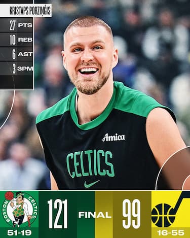 È Kristaps Porzingis con 27 punti, 10 rimbalzi e 6 assist il protagonista principale della netta vittoria dei Celtics sul campo dei Jazz, una partita durante la quale il risultato non pare mai in discussione. Boston trova anche 26 punti, 6 rimbalzi e 6 assist da Jayson Tatum e 18 in uscita dalla panchina da parte del solito Payton Pritchard, mentre Utah può solo parzialmente consolarsi guardando ai 30 punti con 12/16 dal campo di un Collin Sexton mai arrendevole