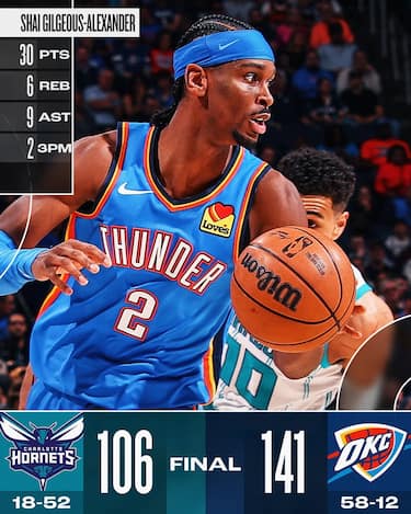 Nella sua stagione contraddistinta dalla corsa al premio di MVP, non sono previste partite in cui non dare il massimo. E così anche contro Charlotte Shai Gilgeous-Alexander lascia il suo marchio, segnando 30 punti e distribuendo 9 assistai compagni in meno di 30 minuti giocati