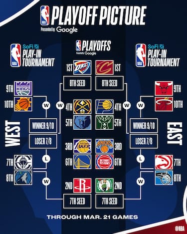 Al momento Phoenix e Miami agguanterebbero gli ultimi posti per il play-in nelle due Conference, mentre Oklahoma City e Cleveland continuano a guardare tutti dall'alto, con i Thunder già sicuri del primo posto e, salvo sorprese davvero clamorose, anche i Cavs destinati a essere teste di serie