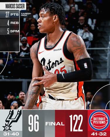 Non c’è storia tra Pistons e Spurs, perché a Detroit gli ospiti vengono tenuti a soli 34 punti in tutto il primo tempo e hanno nel solo Devin Vassell (26 punti e 6 rimbalzi) l’unico elemento positivo di una serata da dimenticare. Tutto facile, invece, per i padroni di casa, che in assenza di Cade Cunningham trovano un eccellente Marcus Sasser da 27 punti con 9/12 al tiro in uscita dalla panchina e 14 punti e 6 rimbalzi da un Ausar Thompson sempre più convincente su entrambi i lati del campo