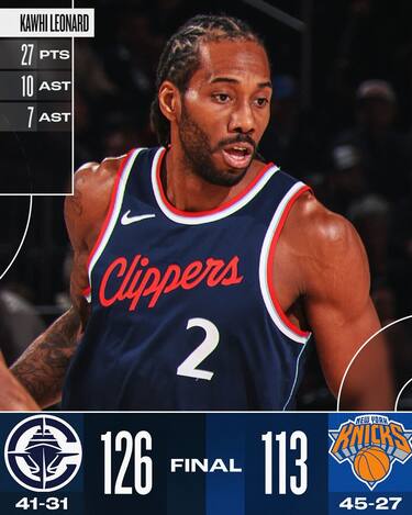 I Knicks partono forte sul 18-5 sbagliando solo uno dei primi 9 tiri tentati, ma da lì in poi si spengono e lasciano campo ai Clippers, che impediscono così loro di assicurarsi aritmeticamente un posto ai playoff. James Harden segna 29 punti e Kawhi Leonard ne aggiunge 27 per tornare a vincere dopo il ko subito per mano di Oklahoma City, trovando anche le solide prestazioni di Norman Powell (19 punti) e Ivica Zubac (18+10)