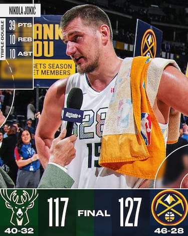 Il tre volte MVP dimostra di non aver dimenticato come si fa una tripla doppia, realizzando la sua 30^ stagionale: 39 punti, 10 rimbalzi e 10 assist per il leader dei Nuggets, tirando col 64% dal campo (ma solo col 57% ai liberi, 4/7) e venendo accompagnato da altri quattro compagni in doppia cifra (23+10 per Michael Porter Jr., 19+10 di Christian Braun, 17 di Jamal Murray e 12 di Peyton Watson)