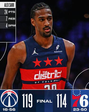 Washington mette subito in chiaro chi ha più voglia di vincere, chiudendo un primo quarto da 45 punti avanti di 16 lunghezze e poi piazzando un altro parziale da 11-0 in apertura di ripresa, tenendo duro fino alla vittoria. I 24 punti del rookie Alex Sarr servono agli ospiti per interrompere una striscia di cinque sconfitte in fila, mentre sono sei i ko consecutivi accumulati dai Sixers — che non vanno oltre i 22 punti del solito Quentin Grimes (9 in fila sopra quota 22) e i 21 di Guershon Yabusele