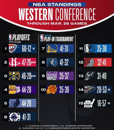 Il successo dei Lakers permette loro di riportarsi al quarto posto ai danni di Memphis, con lo stesso numero di sconfitte di Denver (che però ha due successi in più). I Clippers agganciano Golden State con lo stesso record e si prendono il sesto posto che significa playoff diretti. Dallas e Phoenix hanno lo stesso record, ma il tie-breaker è a favore dei Suns per il 10° posto