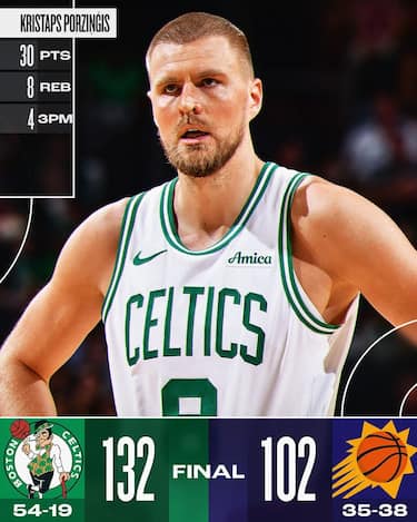 Niente Jayson Tatum? Nessun problema per i campioni in carica, che travolgono Phoenix a domicilio vincendo la settima partita consecutiva. Kristaps Porzingis segna 30 punti e Jaylen Brown ne aggiunge 24, prendendo il controllo delle operazioni sul finire del secondo quarto con un parziale di 27-6 per andare all’intervallo sul +19 senza più voltarsi indietro. Si conclude bruscamente il buon momento dei Suns, a cui non servono i 30 punti di Kevin Durant per allungare la loro striscia di quattro successi in fila