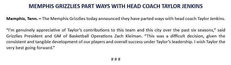 Una notizia lascia a bocca aperta tutti gli osservatori del mondo NBA: i Memphis Grizzlies hanno annunciato, tra la sorpresa generale, il licenziamento del loro capo allenatore, Taylor Jenkins. “Una decisione difficile – ammette il GM della squadra, Zach Kleiman – visto il costante e tangibile miglioramento dei nostri giocatori e il successo negli anni della nostra squadra. Resta il grande apprezzamento per quello che ha fatto per questa città e per questa squadra negli ultimi sei anni”, recita poi il comunicato ufficiale della squadra, con le parole del general manager. Quarti al momento a pari merito con i Lakers nella Western Conference, i Grizzlies sono a una gara e mezza dal terzo posto di Denver ma anche solo due gare sopra la zona play-in. Nella sua permanenza sulla panchina di Memphis, Jenkins vanta una percentuale di vittorie vicinissima al 54% (250 vittorie, 214 sconfitte) e tre partecipazioni ai playoff negli ultimi cinque anni, con la quarta comunque molto probabile (ma un record negativo: 9 vinte, 14 perse). Nella mattinata di Memphis, dopo il secco ko subìto contro Oklahoma City, Jenkins è stato convocato nell’ufficio di Kleiman, dove è stato informato della decisione.