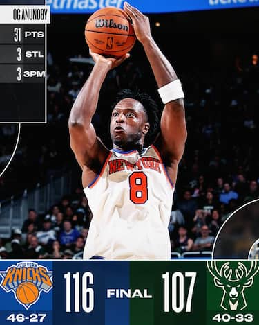 New York passa a Milwaukee e consolida il suo 3° posto a Est, mentre i Bucks continuano a scivolare indietro e ora sono al 6° posto, scavalcati anche dai lanciatissimi Pistons, protagonisti della vittoria sulla capolista Cleveland