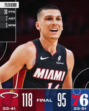 Se gli Heat sembrano essere usciti dalla crisi in cui erano sprofondati dopo 10 sconfitte consecutive, il merito è soprattutto di un Tyler Herro sempre più leader della squadra. La guardia guida i suoi anche nella trasferta diPhiladelphia con una prestazione da 30 punti e 7 assist tirando 11/17 dal campo