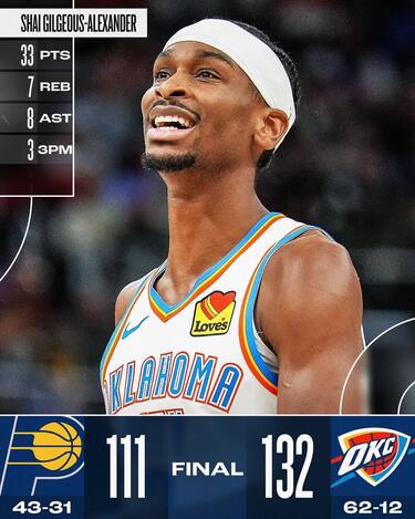 33 punti, 8 assist e 7 rimbalzi in poco più di 31 minuti giocati, ovvero quelli che bastano per stendere i Pacers. Anche contro Indiana il tabellino personale parla chiaro: Shai Gilgeous-Alexander non si ferma e per l’ennesima volta in stagione chiude da migliore in campo