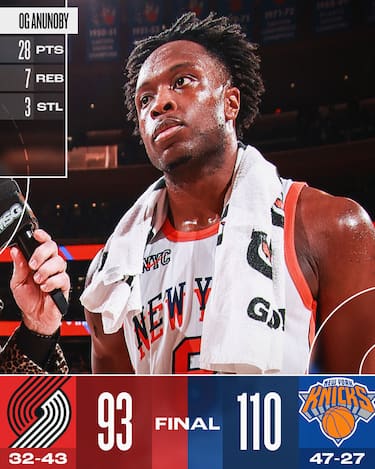Dopo aver chiuso il primo tempo sotto di 8 lunghezze, i Knicks cambiano marcia nella ripresa dominata per 60-35 con il 64% al tiro per portare a casa il successo. OG Anunoby e Mikal Bridges segnano entrambi 28 punti e non lasciano scampo agli ospiti, che si spengono dopo l’ottimo primo tempo nonostante i 33 punti di Deni Avdija (al quinto trentello nell’ultimo mese) e i 23 di Shaedon Sharpe, pagando ancora una volta una difesa deficitaria, una panchina da soli 4 punti segnati (tutti da Duop Reath) e una serataccia di Anfernee Simons (5/20 al tiro per 15 punti finali)