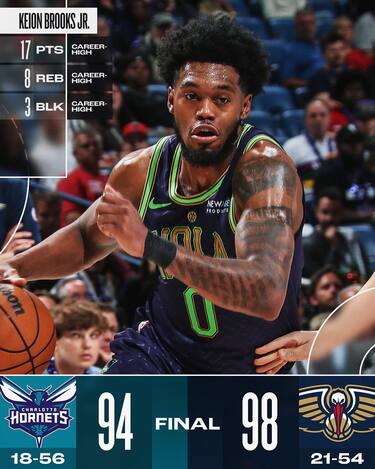 Serve un gioco da tre punti a 31 secondi dalla fine di Jose Alvarado ai Pelicans per avere la meglio sugli Hornets, mettendo la testa avanti e non voltandosi più contro una versione più che rimaneggiata degli Hornets. Gli ospiti, alla quinta sconfitta in fila, non vanno oltre i 20 punti di Miles Bridges e i 19 di Nick Smith Jr., mentre tra i Pelicans a spiccare sono i 17 di Keion Brooks Jr. e i 16 di Antonio Reeves — al termine di un match non indimenticabile in cui le squadre combinano tirando con il 38% dal campo