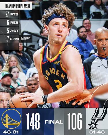 Golden State segna 44 punti nel primo quarto, altri 43 nel terzo e domina a piacimento in Texas, realizzando il suo massimo per punti in questa stagione per riprendersi il sesto posto a Ovest. Steph Curry può comodamente uscire a 3:14 dalla fine del terzo quarto con 13 punti a referto, uno dei sei giocatori in doppia cifra per gli ospiti guidati dai 27 di Brandin Podziemski (7/9 da tre) e i 20 di Moses Moody. Agli Spurs non servono i 19 di Keldon Johnson, subendo la quarta sconfitta in fila e concedendo il massimo stagionale per punti subiti