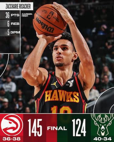 Per una sera il grande protagonista per Atlanta è l’ultima prima scelta assoluta al Draft Zaccharie Risacher, che realizza il suo massimo in carriera da 36 punti grazie a un ottima serata al tiro pesante (5/11 da tre), ispirato dalla doppia doppia di un Trae Young che tira male (4/16 per 19 punti) ma fa felici tutti i suoi compagni (19 assist). Dyson Daniels è decisivo nelle due metà campo con 22 punti, 9 rimbalzi, 6 assist e soprattutto 5 recuperi, che gli permettono di realizzare il record di franchigia per rubate in singola stagione a quota 213, superando Mookie Blaylock