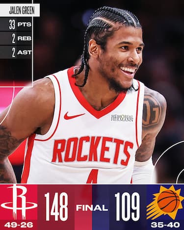 La peggior notizia della serata dei Suns non è nemmeno la "ripassata" presa in casa dai Rockets, ma la distorsione alla caviglia subita da Kevin Durant a metà terzo quarto senza più rientrare in campo, complice anche un punteggio già ampiamente compromesso. I Rockets infatti erano avanti di 29 lunghezze già all’intervallo, guidati alla fine dai 33 punti di Jalen Green e da altri sette compagni in doppia cifra in una gara mai in discussione in cui hanno tirato meglio da tre punti (58%) che dal campo (57%), rendendo inutili i 28 punti di Devin Booker per i Suns — arrivati alla terza sconfitta in fila e scivolati a due gare di distanza da Dallas per il decimo posto a Ovest