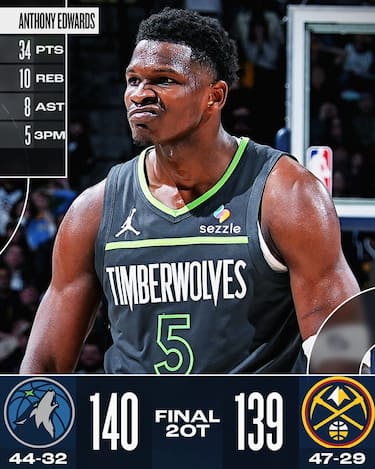 La partita di Anthony Edwards contro i Nuggets non sconfina nella storia come quella giocata da Jokic, ma la stella di Minnesota è decisiva prima nel 4° quarto dove rimette in corsa i suoi a suon di canestri e poi sul possesso finale del secondo supplementare, dove è lucidissimo nel trovare Alexander-Walker sul perimetro con l’assist che poi genera la tripla tentata e il fallo di Westbrook che segna il risultato finale. Per Ant alla fine il tabellino dice 34 punti, 10 rimbalzi e 8 assist