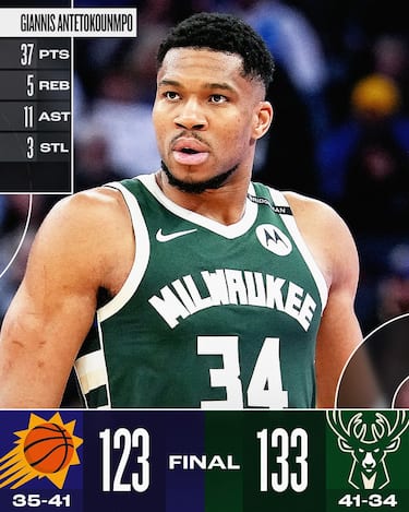 Non c’è molto da discutere sulla vittoria di Milwaukee, che annienta Phoenix soprattutto grazie a un’altra grande serata di Giannis Antetokounmpo. Il greco chiude con 37 punti, 11 rimbalzi, 5 assist, 3 palle recuperate e 12/18 dal campo, senza lasciare scampo alla difesa dei Suns