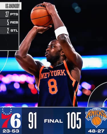 Tutto facile per i Knicks, che ritrovano un Mitchell Robinson da 14 punti e 14 rimbalzi, hanno 27 punti da OG Anunoby e 20 in uscita dalla panchina da Landry Shamet e controllano senza problemi fin dall’inizio la sfida contro Philadelphia. Per i Sixers Quentin Grimes, ex di serata, sembra l’unico ad avere motivazioni particolari e chiude da migliore dei suoi con 26 punti e 5 assist che però non spostano minimamente l’inerzia di una gara sempre in mano a New York