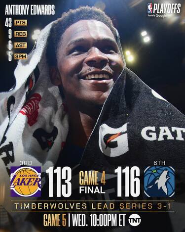 La gara-4 tra Timberwolves e Lakers segue le orme della precedente gara-3: gli ospiti rimangono a lungo in vantaggio, ma in uno splendido e selvaggio finale di partita sono le maggiori energie dei padroni di casa a fare la differenza. Il 116-113 con cui si conclude il match regala ai T'Wolves il 3-1 nella serie, portandosi ora a una sola vittoria dal passaggio del turno per affrontare poi la vincente tra Golden State e Houston