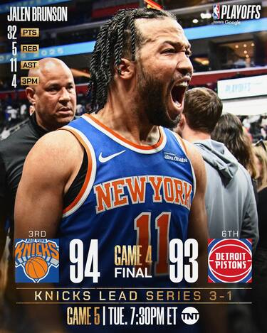 Nel 4° periodo Brunson e Towns segnano 23 punti in due, più dei 22 messi assieme da tutti i Pistons messi assieme. Il playmaker è il miglior realizzatore dei suoi con 32 punti e 11 assist, mentre il lungo ne mette 27 con 9 rimbalzi e 5/7 da tre, accompagnato da un Josh Hart onnipresente (14 punti, 10 rimbalzi, 5 assist e 4 recuperi). New York tira solamente col 37.4% di squadra, ma realizza 15 delle 33 triple tentateed è più lucida nel finale, portandosi sul 3-1 nella serie