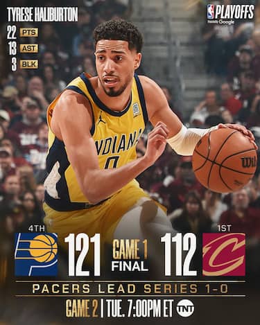 Dopo aver deciso gara-5 della serie con Milwaukee al turno precedente, nei momenti cruciali di gara-1 a Cleveland è ancora una volta Tyrese Haliburton a guidare i Pacers. È lui, infatti, ad aprire il parziale che nel 4° quarto manda in fuga Indiana prima con una tripla e a chiuderlo con un appoggio, sigillando così una prova da 22 punti e 13 assist con 9/15 al campo