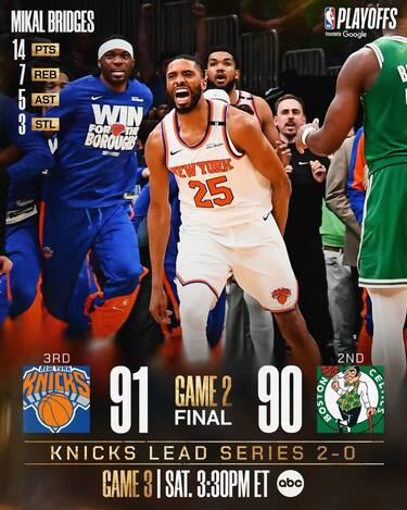 In gara-1 aveva rubato palla a Jaylen Brown sul possesso che nel supplementare poteva regalare il tiro della possibile vittoria ai Celtics, in gara-2 Mikal Bridges si produce in una spettacolare stoppata su Jayson Tatum che sigilla il colpo del 2-0 sui Knicks quasi sulla sirena, poco prima Jalen Brunson aveva portato in vantaggio i Knicks con due liberi segnati. È l’apice di una grande partita giocata dall’ex Suns e Nets, che chiude con 14 punti, segnati tutti nel 4° quarto, 7 rimbalzi, 5 assist e un’altra giocata decisiva