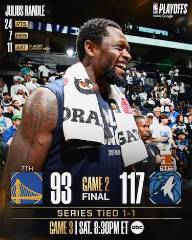 I Minnesota Timberwolves pareggiano i conti nella serie contro i Golden State Warriors senza andare sotto neanche per un secondo in gara-2. Dopo aver cominciato il match con un parziale di 13-0, i padroni di casa hanno toccato anche il +22 nel corso del primo tempo e sono rimasti avanti fino alla fine, concedendo al massimo agli ospiti di rientrare fino al -7. Il migliore in campo è Julius Randle con 24 punti e 11 assist, mentre Anthony Edwards fa tremare i suoi tifosi nel primo tempo uscendo per una distorsione alla caviglia, ma è in grado di giocare nel secondo tempo e chiude a quota 20. Coach Steve Kerr, privo di Steph Curry, schiera 14 giocatori nel primo tempo (non accadeva ai playoff dal 1998), ma non va oltre i 18 punti di Jonathan Kuminga e i 17 di Jimmy Butler, mentre Draymond Green prende il quinto fallo tecnico dei suoi playoff — a -2 dalla sospensione automatica