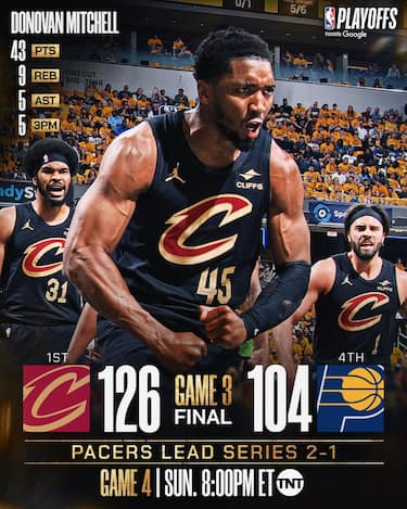 Dopo essersi fatti rimontare e battere in gara-1 e dopo essere stati incredibilmente beffati nel finale di gara-2, i Cavs ritrovano gli infortunati Darius Garland (10 punti) e Evan Mobley (18 punti e 13 rimbalzi), piazzano un parziale decisivo già nel 2° quarto e vanno a prendersi gara-3 sul campo dei Pacers. Indiana, dopo le imprese delle prime due sfide della serie, questa volta non riesce a rientrare in partita dopo aver accumulato uno svantaggio di oltre 20 punti, viene letteralmente surclassata a rimbalzo (56-37 il conteggio in favore degli ospiti), tira 9/30 e di fatto dopo un buon 1° quarto non ritrova più il proprio ritmo