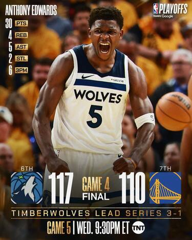 Ancora senza Steph Curry, dato come possibile rientrante in gara-5, la resistenza degli Warriors dura un tempo. Dopo essere andata all’intervallo lungo avanti 60-58, infatti, Golden State crolla sotto i colpi dei T’Wolves nel 3° quarto, con gli ospiti che piazzano un parziale micidiale di 17-0 e da lì in poi non si guardano più indietro, rischiando solo un minimo nel finale per un paio di incertezze. I padroni di casa provano a mischiare le carte, coach Steve Kerr ricorre alla sua panchina in cerca del fattore sorpresa ma Minnesota conferma tutta la sua superiorità su entrambi i lati del campo e con una prova di grande maturità e autorevolezza si porta avanti 3-1 nella serie ed è a una sola vittoria dal ritorno alle finali della Western Conference ad un anno di distanza da quelle perse contro Dallas