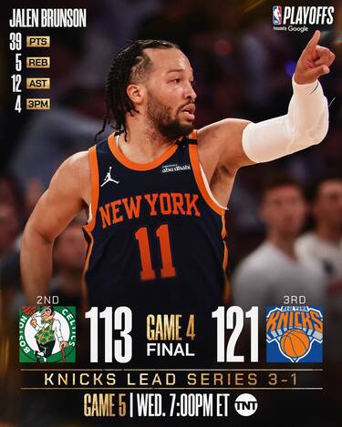 In un Madison Square Garden molto vicino al delirio collettivo, i Knicks subiscono Boston nel primo tempo e vanno all’intervallo lungo con uno svantaggio di 11 punti e l’impressione che gara-4 possa trasformarsi nella replica di gara-3, dominata dagli ospiti. Al ritorno in campo, però, New York cambia marcia, riesce a prendersi il pitturato (64-32 il conteggio dei punti segnati in area in favore dei padroni di casa) ribalta il risultato nel 3° quarto e nel finale del 4° quarto piazza un parziale di 14-2 che sancisce il colpo del 3-1 nella serie e lascia i ragazzi di coach Tom Thibodeau a una sola vittoria dalle prime finali della Eastern Conference negli ultimi 25 anni di storia della franchigia